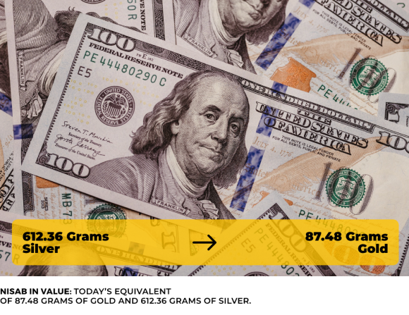 Nisab is the minimum amount of net capital a Muslim possesses (such as gold, silver, cash ,stocks, property, etc.) over a lunar year to become obligatory for giving Zakat. It is determined based on the current market value of gold or silver. When an individual’s wealth surpasses this threshold, they must pay Zakat on their excess wealth.